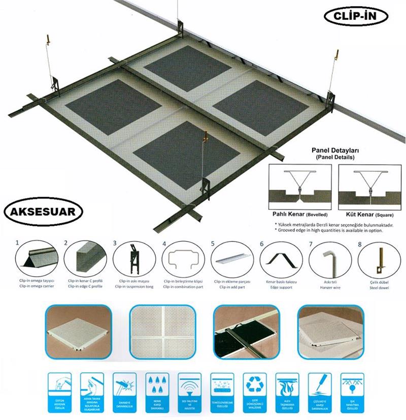 Standart (clip-in) sistem, galvaniz ve alüminyum plakaların üçgen kesitli omega taşıcıya alttan takılması ile olur. Bu clip-in sistemde taşıyıcılar gözükmez, sarkmalı ve oturmalı sisteme göre güzel ve sade bir gürüntü meydana gelir. Sökülüp takılması kolaydır.
